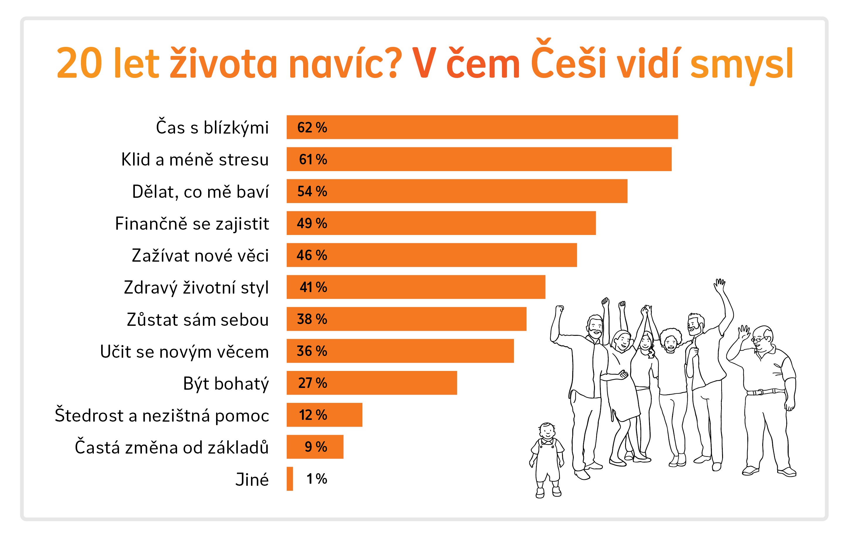 S vidinou prodlužující se délky dožití Češi považují za největší smysl života trávení času s rodinou a svými blízkými (62 %). Dávají také přednost klidnějšímu tempu bez zbytečného stresu (61 %). Zhruba poloviční podporu v žebříčku životních priorit pak získala potřeba sbírat nové zážitky a podobně často zmiňovali cestování a objevování nových věcí, technologií a kultur.
